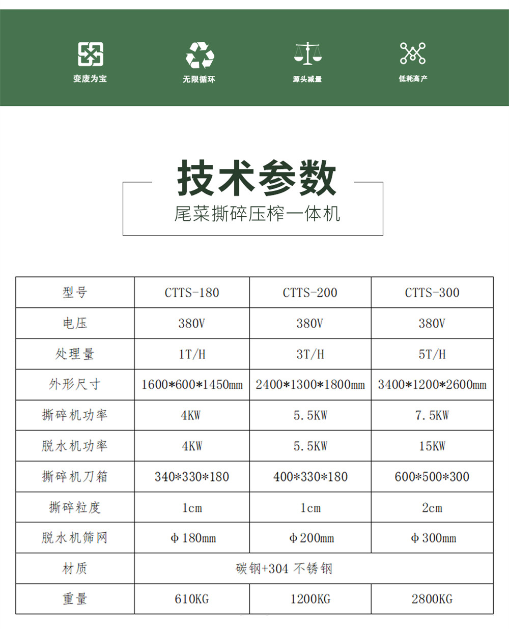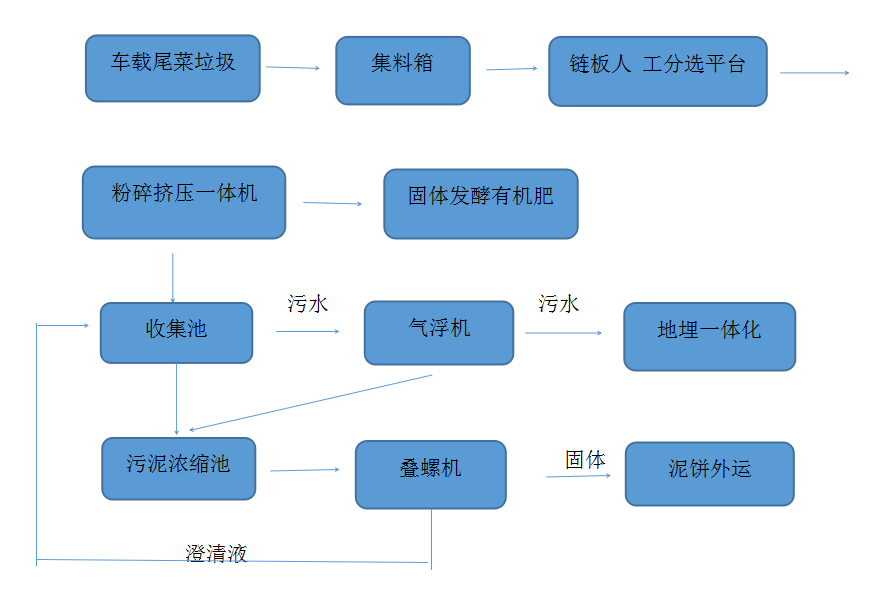 尾菜來料后進(jìn)入集料箱緩存,然后經(jīng)底部螺旋輸送至鏈板平臺;鏈板輸送機(jī)設(shè)計為“Z”型,后端作為人工分選平臺,中間設(shè)備自動除鐵器,去除尾菜垃圾中的鐵制品;經(jīng)過分選的尾菜垃圾隨后進(jìn)入粉碎擠壓一體機(jī)進(jìn)行減量。經(jīng)過擠壓后的固體垃圾進(jìn)入發(fā)酵倉進(jìn)行發(fā)酵,用作有機(jī)肥;液體進(jìn)入收集池中緩存。收集池中的液體隨后泵入氣浮機(jī),去除大量懸浮物,氣浮后的浮渣進(jìn)入疊螺機(jī),污水則進(jìn)入地埋一體化設(shè)備,*后達(dá)標(biāo)排放。